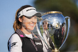 Canada's Brooke Henderson poses with the trophy after winning the CPKC Women's Open golf tournament at the Mississauga Golf and Country Club in Mississauga, Ontario, Sunday, Aug. 24, 2025. (Thomas Skrlj/The Canadian Press via AP)