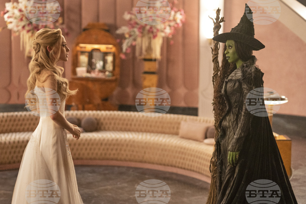 This image released by Universal Pictures shows Ariana Grande, left, and Cynthia Erivo in a scene from "Wicked for Good." (Universal Pictures via AP)