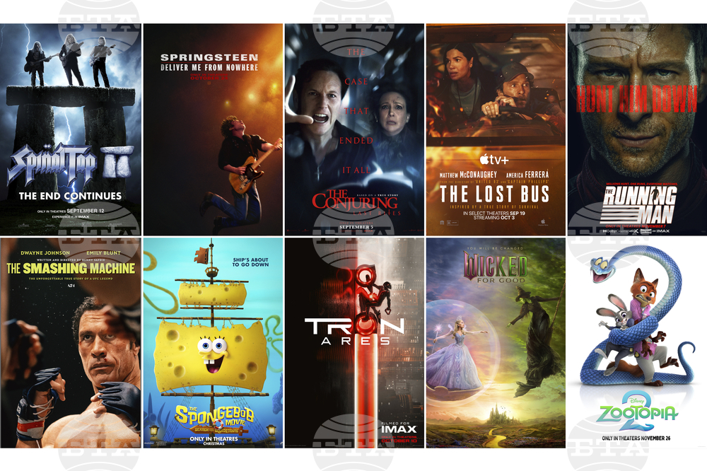 This combination of images shows promotional art for the films "Spinal Tap: The End Continues," top row from left, "Springsteen: Deliver Me from Nowhere ,"The Conjuring" Last Rites," "The Lost Bus," "The Running Man," bottom row from left, "The Smashing Machine," "The SpongeBob Movie: Search for Squarepants," "Tron: Ares," "Wicked: For Good," and "Zootopia 2." (Bleecker Street/Disney/Warner Bros./Apple TV+/Paramount/A24/Paramount/Disney/Disney/Universal/Disney via AP)