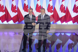 Canada Prime Minister Mark Carney, left and Polish Prime Minister Donald Tusk take part in a joint press conference at the Chancellery of the Prime Minister in Warsaw, on Monday, Aug. 25, 2025. (Christinne Muschi/The Canadian Press via AP)