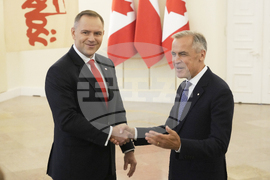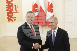 Canadian Prime Minister Mark Carney, right, is welcomed by Poland's President Karol Nawrocki, left, in Warsaw, Poland, Monday, Aug. 25, 2025. (AP Photo/Czarek Sokolowski)