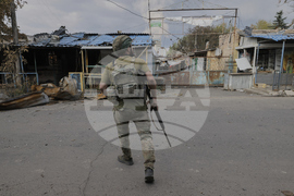 A local resident runs along a damaged street in the town of Kostiantynivka, the site of heavy battles with Russian troops in the Donetsk region, Ukraine, on Sunday, Aug. 24, 2025. (AP Photo/Yevhen Titov)