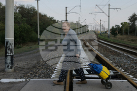 A local resident carries her belongings as she leaves her home town of Kostiantynivka, the site of heavy battles with Russian troops in the Donetsk region, Ukraine, on Sunday, Aug. 24, 2025. (AP Photo/Yevhen Titov)