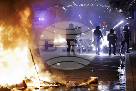 Riot police officers intervene in Lausanne, Switzerland, Tuesday Aug. 26, 2025, during the second night of riots following the fatal accident involving a young minor who was riding on a stolen two-wheeler scooter and fleeing from a police patrol on Monday, Aug. 25, 2025. (Cyril Zingaro/Keystone via AP)
