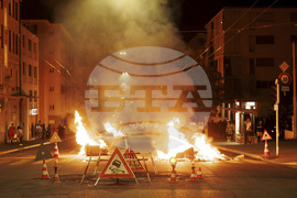 Burning containers block the street during the second night of riots in Lausanne, Switzerland, Tuesday Aug. 26, 2025, following the fatal accident involving a young minor who was riding on a stolen two-wheeler scooter and fleeing from a police patrol on Monday, Aug. 25, 2025. (Cyril Zingaro/Keystone via AP)
