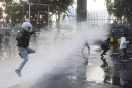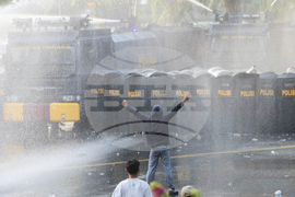 Protesters react as they get sprayed by a police water cannon truck during a protest against lavish allowances given to parliament members, in Medan, North Sumatra, Indonesia, Tuesday, August. 26, 2025. (AP Photo/Binsar Bakkara)