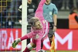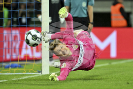 VfB Stuttgart goalkeeper Alexander Nübel saves a penalty during a penalty shootout against Eintracht Braunschweig during a DFB Pokal, German Cup, soccer match, Tuesday, Aug. 26, 2205, in Brunswick, Germany. (Swen Pförtner/dpa via AP)