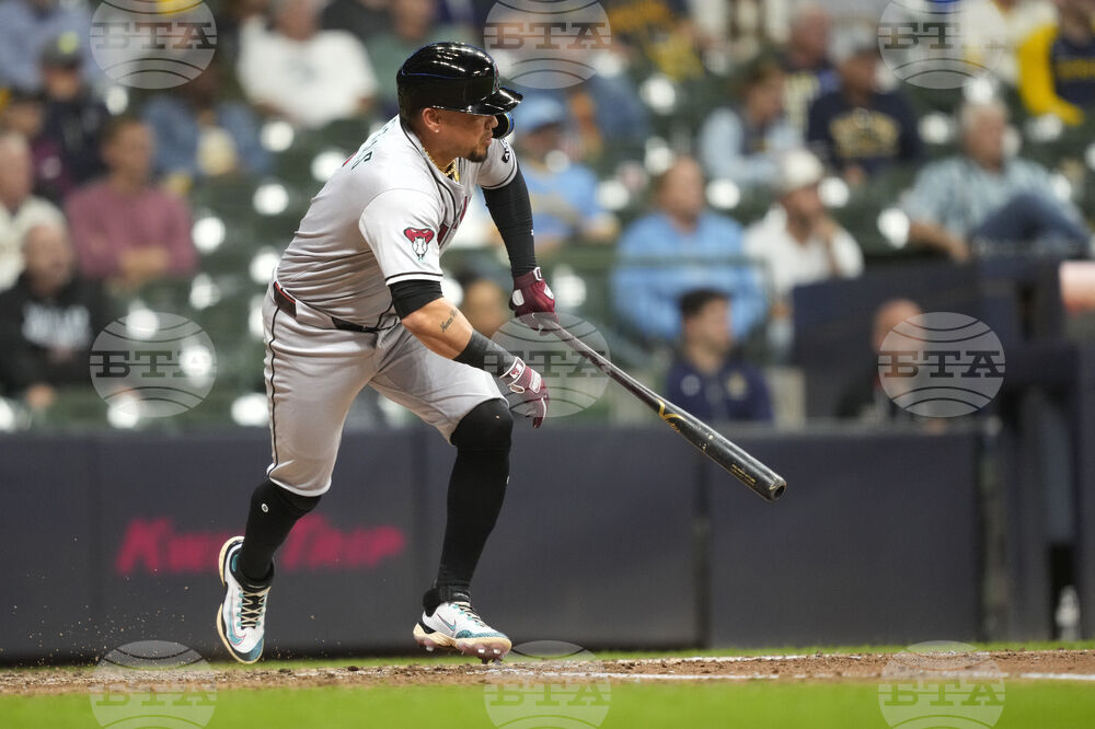 Arizona Diamondbacks' Ildemaro Vargas (6) hits a two run RBI single during the eighth inning of a baseball game against the Milwaukee Brewers Tuesday, Aug. 26, 2025, in Milwaukee. (AP Photo/Kayla Wolf)