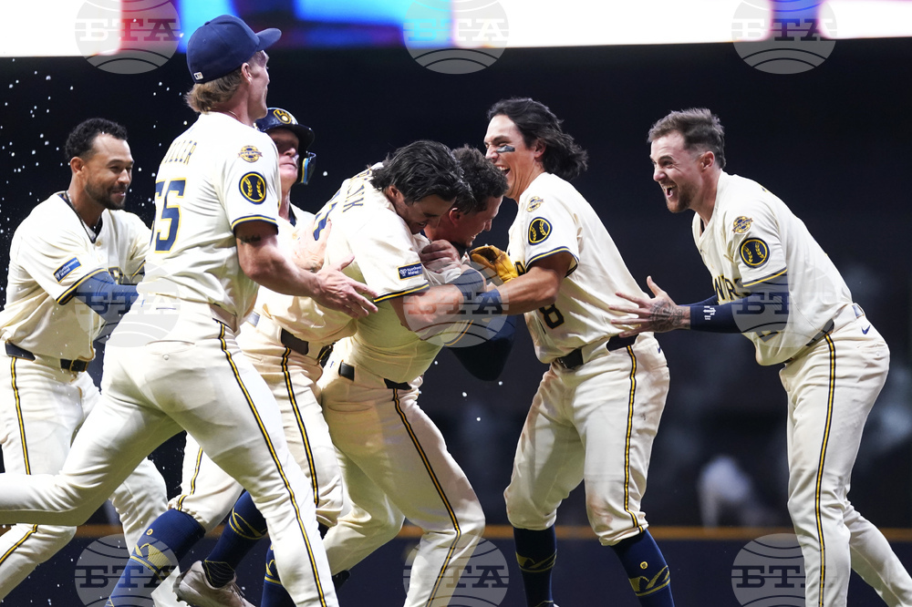 Milwaukee Brewers' Isaac Collins, center, is hugged by Sal Frelick, center left, and Anthony Seigler, second from right, after hitting a walk-off sacrifice fly during a baseball game against the Arizona Diamondbacks, Tuesday, Aug. 26, 2025, in Milwaukee. (AP Photo/Kayla Wolf)