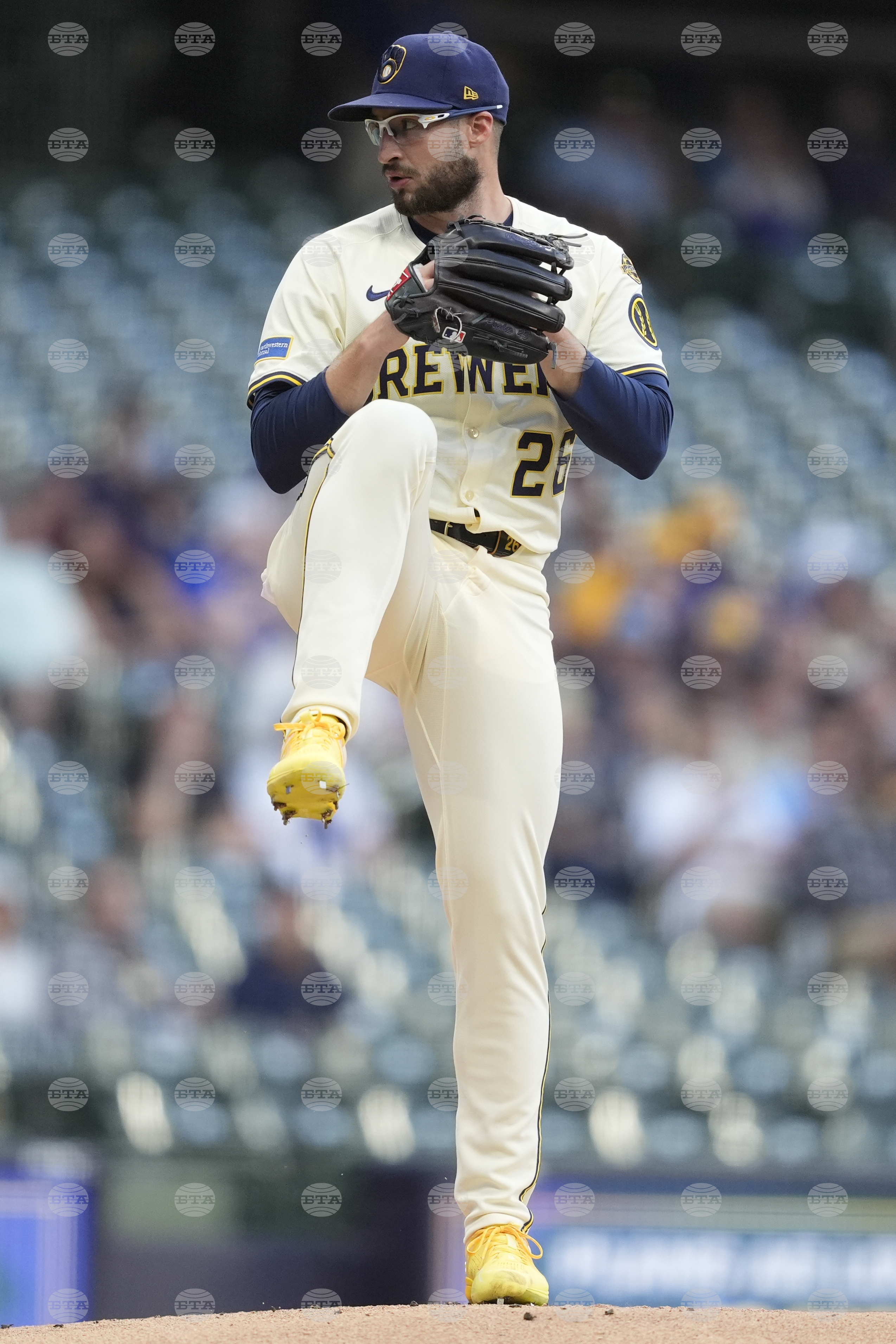 Milwaukee Brewers' Aaron Ashby pitches during the first inning of a baseball game against the Arizona Diamondbacks, Wednesday, Aug. 27, 2025, in Milwaukee. (AP Photo/Aaron Gash)