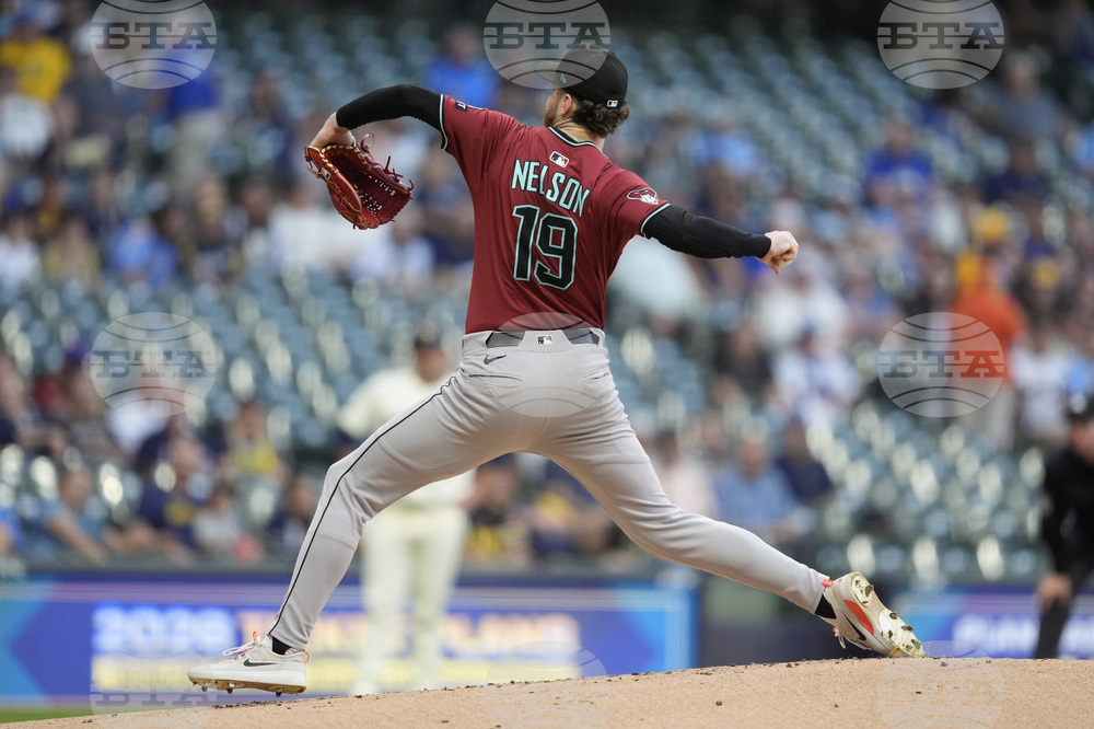 Arizona Diamondbacks' Ryne Nelson pitches during the first inning of a baseball game against the Milwaukee Brewers, Wednesday, Aug. 27, 2025, in Milwaukee. (AP Photo/Aaron Gash)