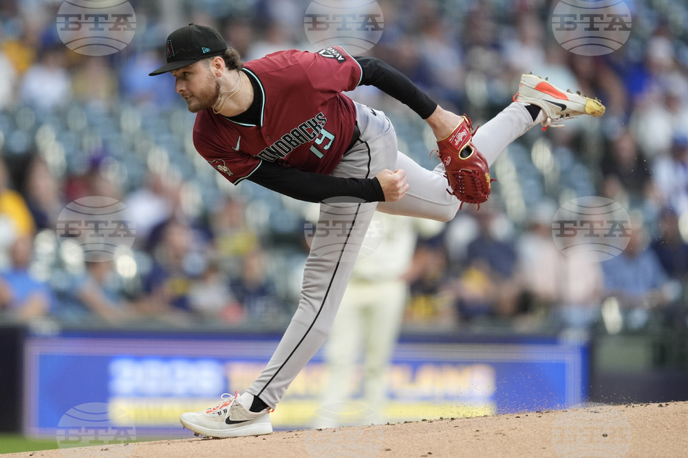 Arizona Diamondbacks pitcher Brandon Pfaadt throws against the Milwaukee Brewers during the first inning of a baseball game, Tuesday, Aug. 26, 2025, in Milwaukee. (AP Photo/Kayla Wolf)