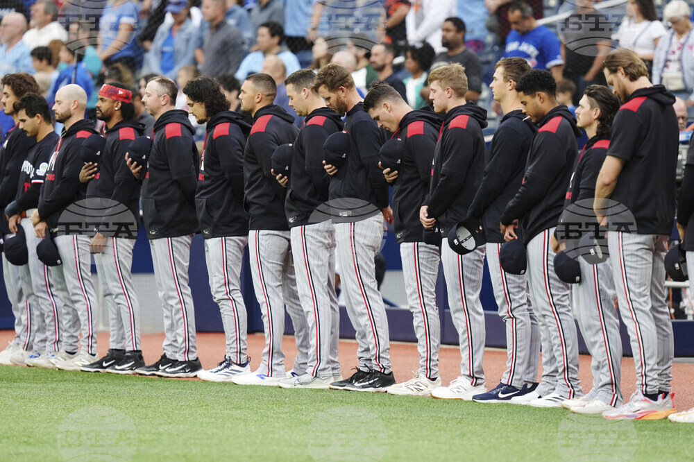 Minnesota Twins players stand for a moment of silence to honor the victims of a shooting at Annunciation Catholic School in Minneapolis prior to MLB baseball action against the Toronto Blue Jays in Toronto on Wednesday, August 27, 2025. (Chris Young/The Canadian Press via AP)