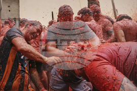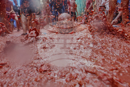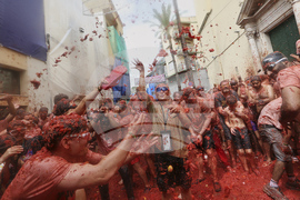 Revelers throw tomatoes at each other during the annual "Tomatina" tomato fight fiesta, in the village of Bunol near Valencia, Spain, Wednesday, Aug. 27, 2025. (AP Photo/Alberto Saiz)