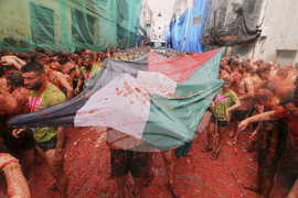 Revelers hold a Palestinian flag as they throw tomatoes at each other during the annual "Tomatina" tomato fight fiesta, in the village of Bunol near Valencia, Spain, Wednesday, Aug. 27, 2025. (AP Photo/Alberto Saiz)