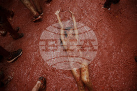 Revelers throw tomatoes at each other during the annual "Tomatina" tomato fight fiesta, in the village of Bunol near Valencia, Spain, Wednesday, Aug. 27, 2025. (AP Photo/Alberto Saiz)