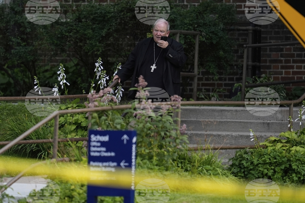The archbishop of Saint Paul and Minneapolis, Bernard Hebda talks on the phone outside the Annunciation Church's school after shooting, Wednesday, Aug. 27, 2025, in Minneapolis. (AP Photo/Abbie Parr)