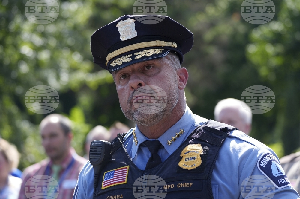 Minneapolis Police Chief Brian O'Hara stands outside the Annunciation Catholic School following a shooting Wednesday, Aug. 27, 2025, in Minneapolis. (AP Photo/Bruce Kluckhohn)