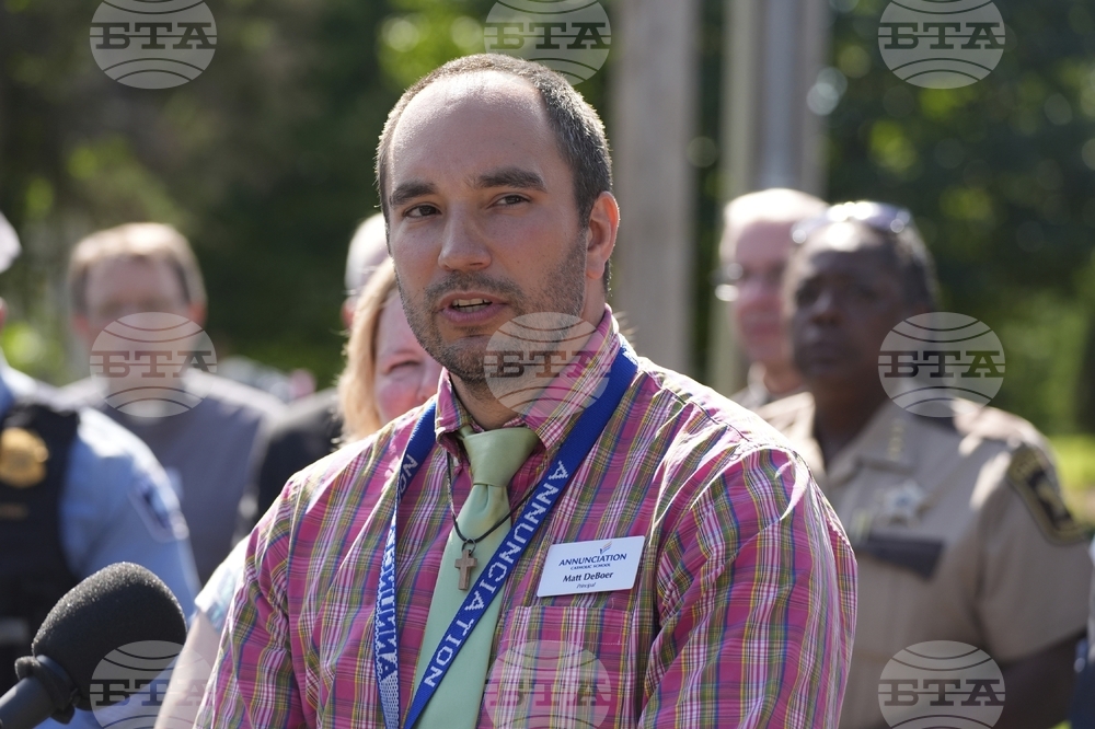 Annunciation Catholic School Principle Matt DeBoer speaks outside the Annunciation Catholic School following a shooting Wednesday, Aug. 27, 2025, in Minneapolis. (AP Photo/Bruce Kluckhohn)