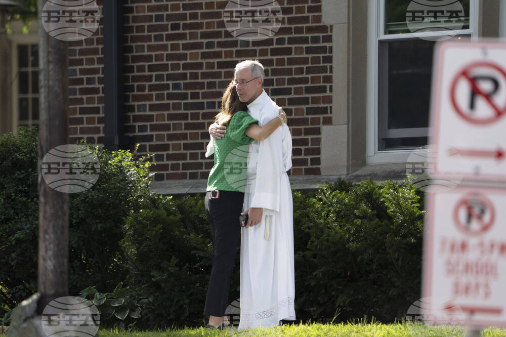 A clergyman is embraced at the scene of a shooting at Annunciation Church, Wednesday, Aug. 27, 2025, in Minneapolis. (Renée Jones Schneider/Star Tribune via AP)