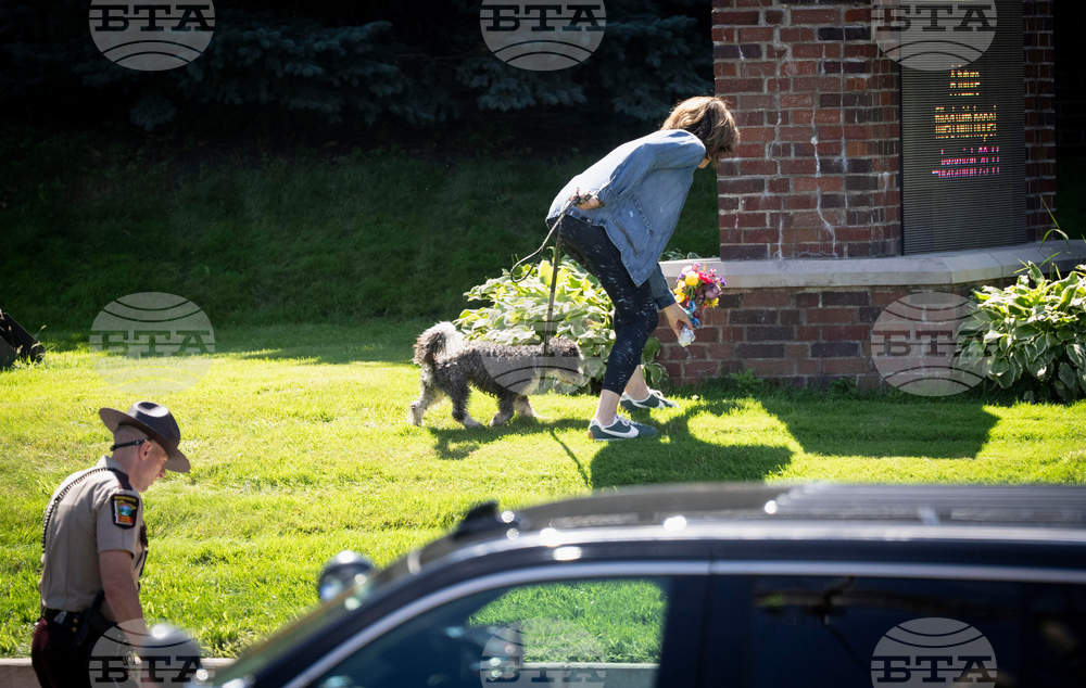 A woman is allowed to drop off flowers at the Annunciation Catholic School sign near the scene of a shooting at Annunciation Catholic Church, Wednesday, Aug. 27, 2025, in Minneapolis. (Renée Jones Schneider/Star Tribune via AP)