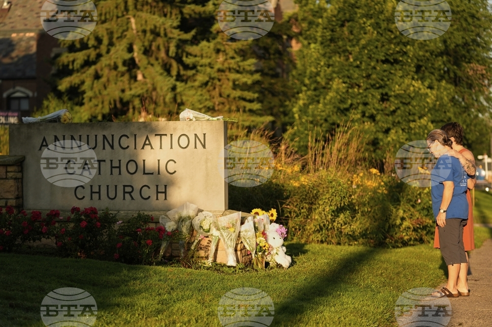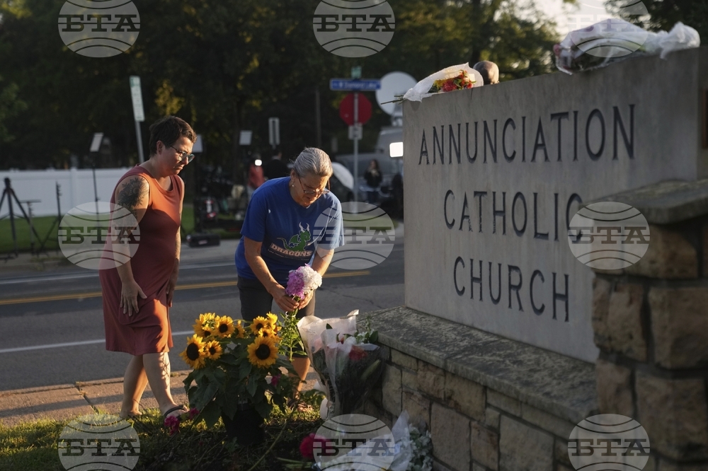 People visit at a a make-shift memorial at Annunciation Catholic Church after Wednesday's school shooting, Thursday, Aug. 28, 2025, in Minneapolis. (AP Photo/Abbie Parr)