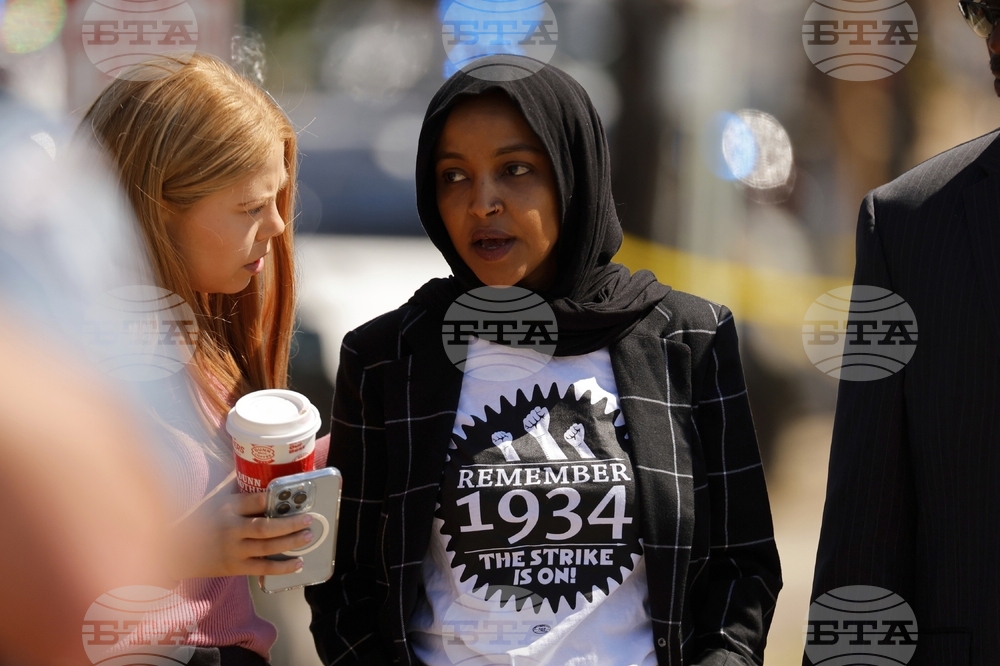 Rep. Ilhan Omar, D-Minn., talks to reporters outside the Annunciation Catholic School following a shooting Wednesday, Aug. 27, 2025, in Minneapolis. (AP Photo/Bruce Kluckhohn)