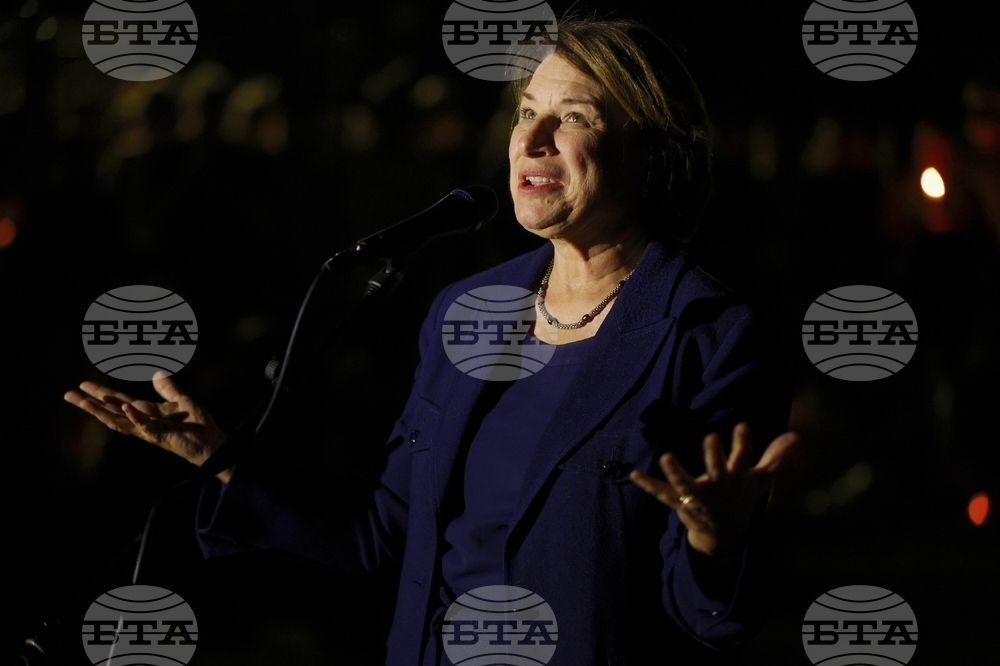 Sen. Amy Klobuchar, D-Minn., speaks as people gather at a vigil at Lynnhurst Park after a shooting at the Annunciation Catholic School Wednesday, Aug. 27, 2025, in Minneapolis. (AP Photo/Bruce Kluckhohn)