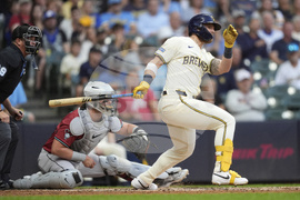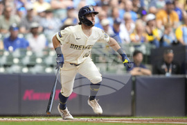 Milwaukee Brewers' Brice Turang hits a single during the third inning of a baseball game against the Arizona Diamondbacks, Thursday, Aug. 28, 2025, in Milwaukee. (AP Photo/Kayla Wolf)