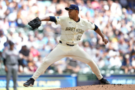 Milwaukee Brewers pitcher Jose Quintana (62) throws during the first inning of a baseball game against the Arizona Diamondbacks, Thursday, Aug. 28, 2025, in Milwaukee. (AP Photo/Kayla Wolf)