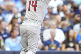 Milwaukee Brewers' Christian Yelich grounds out during the ninth inning of a baseball game against the Arizona Diamondbacks, Thursday, Aug. 28, 2025, in Milwaukee. (AP Photo/Kayla Wolf)