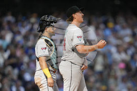 Arizona Diamondbacks catcher Gabriel Moreno, left, walks to the mound with pitcher Taylor Rashi during the ninth inning of a baseball game against the Milwaukee Brewers, Thursday, Aug. 28, 2025, in Milwaukee. (AP Photo/Kayla Wolf)