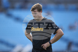FILE - Pittsburgh Steelers quarterback Will Howard (18) warms up prior to an NFL preseason football game against the Carolina Panthers, Aug. 21, 2025, in Charlotte, N.C. (AP Photo/Brian Westerholt, File)