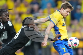 Brondby's Daniel Wass, left, and RC Strasbourg's Félix Lemaréchal vies for the ball in the Conference League play off soccer match between Brondby IF and Racing Club Strasbourg at Brondby Stadion, Brondby, Denmark, Thursday Aug. 28, 2025. (Liselotte Sabroe/Ritzau Scanpix via AP)