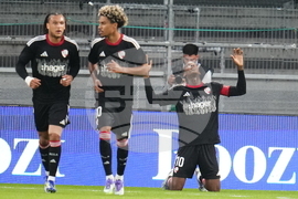 RC Strasbourg's Emanuel Emegha, center, celebrates scoring with teammates during the Conference League play off soccer match between Brondby IF and Racing Club Strasbourg at Brondby Stadion, Brondby, Denmark, Thursday Aug. 28, 2025. (Liselotte Sabroe/Ritzau Scanpix via AP)
