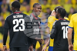 RC Strasbourg's Emanuel Emegha, right, reacts after scoring against Brondby during a Conference League soccer match, Thursday, Aug. 28, 2025, in Brondby, Denmark. (Liselotte Sabroe/Ritzau Scanpix via AP)