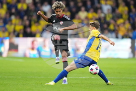 RC Strasbourg's Félix Lemaréchal, left, and Brondby's Filip Bundgaard in action during the Conference League play off soccer match between Brondby IF and Racing Club Strasbourg at Brondby Stadion, Brondby, Denmark, Thursday Aug. 28, 2025. (Liselotte Sabroe/Ritzau Scanpix via AP)