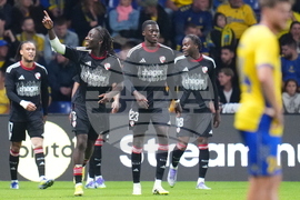 RC Strasbourg's Ismael Doukouré, second left, celebrates scoring with teammates during the Conference League play off soccer match between Brondby IF and Racing Club Strasbourg at Brondby Stadion, Brondby, Denmark, Thursday Aug. 28, 2025. (Liselotte Sabroe/Ritzau Scanpix via AP)