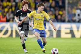 Broendbys Filip Bundgaard, right, and Strasbourg's Valentin Barco in action during the Conference League play off soccer match between Brondby IF and Racing Club Strasbourg at Brondby Stadion, Brondby, Denmark, Thursday Aug. 28, 2025. (Liselotte Sabroe/Ritzau Scanpix via AP)