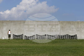 Alvin Butler rides his bike along a commemorative mural on the floodwall in the Lower Ninth Ward of New Orleans, Friday, Aug. 29, 2025, on the 20th anniversary of Hurricane Katrina. (AP Photo/Alex Brandon)