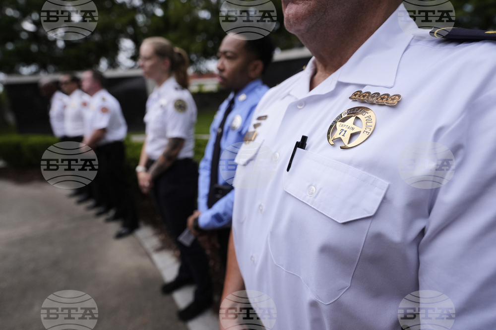 New Orleans police, fire and EMS stand at attention during a wreath laying event to commemorate the 20th anniversary of Hurricane Katrina, at the Hurricane Katrina Memorial in Charity Hospital Cemetery in New Orleans, Friday, Aug. 29, 2025. (AP Photo/Gerald Herbert)