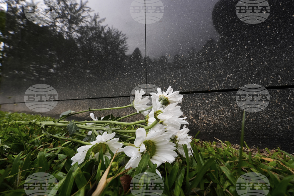 Flowers lie on the ground in front of tombs of unidentified bodies during a wreath laying event to commemorate the 20th anniversary of Hurricane Katrina, at the Hurricane Katrina Memorial in Charity Hospital Cemetery in New Orleans, Friday, Aug. 29, 2025. (AP Photo/Gerald Herbert)