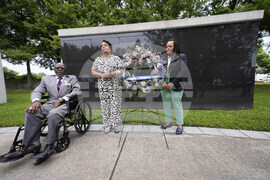 New Orleans Mayor Latoya Cantrell, right, stands with Jamminne Navarre and Rev. Robert Jackson during a wreath laying event to commemorate the 20th anniversary of Hurricane Katrina, at the Hurricane Katrina Memorial in Charity Hospital Cemetery in New Orleans, Friday, Aug. 29, 2025. (AP Photo/Gerald Herbert)
