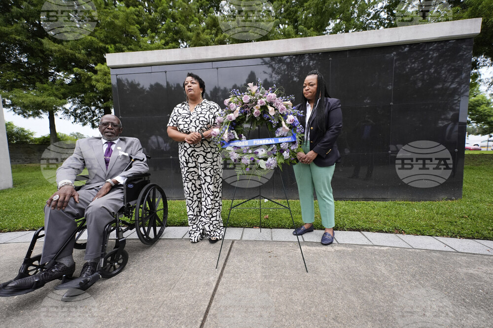The New Orleans Katrina Memorial stands behind Dr. Michael White during a wreath laying event to commemorate the 20th anniversary of Hurricane Katrina in Charity Hospital Cemetery in New Orleans, Friday, Aug. 29, 2025. (AP Photo/Gerald Herbert)