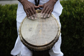 Luther Gray of the Congo Square Preservation Society plays a traditional African drum during an event to commemorate the 20th anniversary of Hurricane Katrina in New Orleans, Friday, Aug. 29, 2025. (AP Photo/Gerald Herbert)