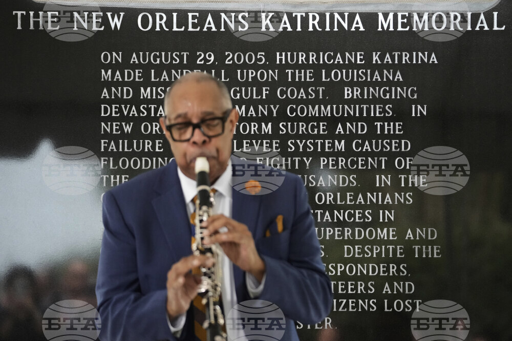 Dr. Michael White plays 'A Closer Walk With Thee' during a wreath laying event to commemorate the 20th anniversary of Hurricane Katrina, at the Hurricane Katrina Memorial in Charity Hospital Cemetery in New Orleans, Friday, Aug. 29, 2025. (AP Photo/Gerald Herbert)