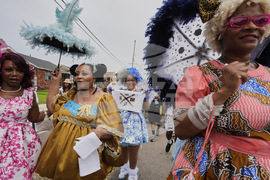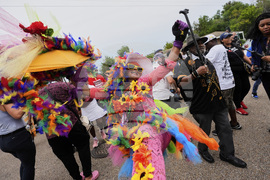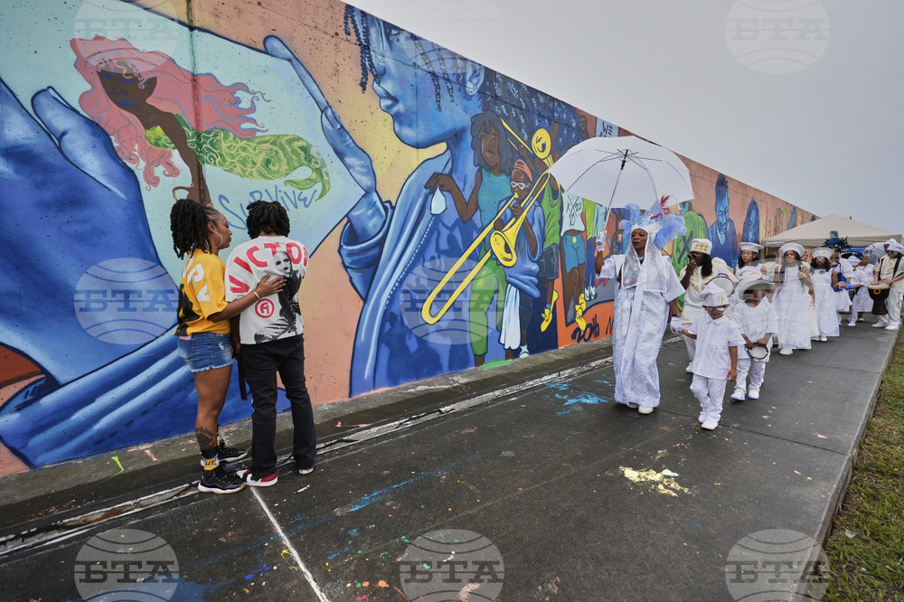 People walk in a second line parade during an event to commemorate the 20th anniversary of Hurricane Katrina, in the Lower Ninth Ward of New Orleans, Friday, Aug. 29, 2025. (AP Photo/Alex Brandon)