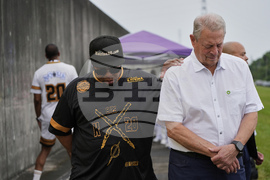 Former Vice President Al Gore prays with Rev. Lennox Yearwood as he walks along the floodwall in the Lower Ninth Ward of New Orleans during an event to commemorate the 20th anniversary of Hurricane Katrina, Friday, Aug. 29, 2025. (AP Photo/Alex Brandon)
