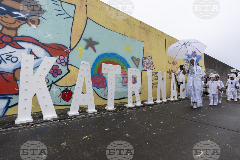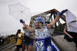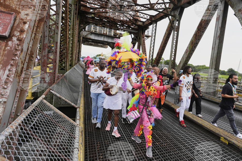 The Congo Kids arrive to perform during an event to commemorate the 20th anniversary of Hurricane Katrina, along the levee wall in the Lower Ninth Ward, Friday, Aug. 29, 2025, in New Orleans. (AP Photo/Alex Brandon)
