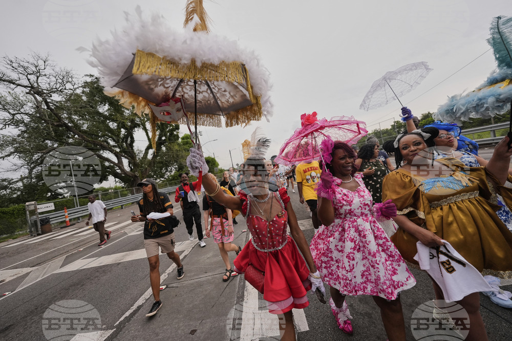Members of the Original New Orleans Baby Dolls march in a second line parade to commemorate the 20th anniversary of Hurricane Katrina, in the Lower Ninth Ward of New Orleans, Friday, Aug. 29, 2025. (AP Photo/Gerald Herbert)